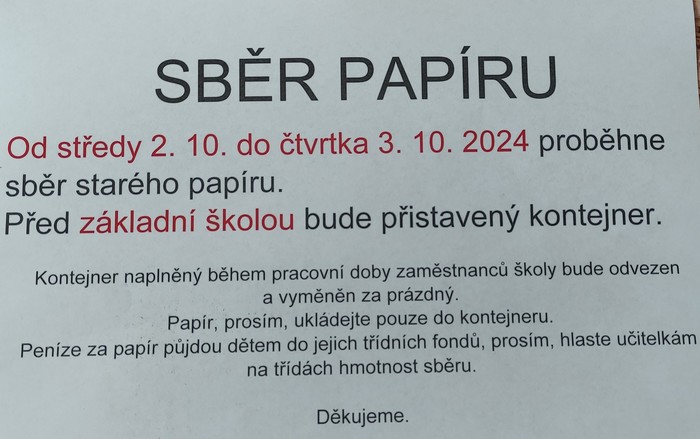 Papír, prosím, ukládejte pouze do kontejneru. Peníze za papír půjdou dětem do jejich třídních fondů, prosím, hlaste učitelkám na třídách hmotnost sběru.