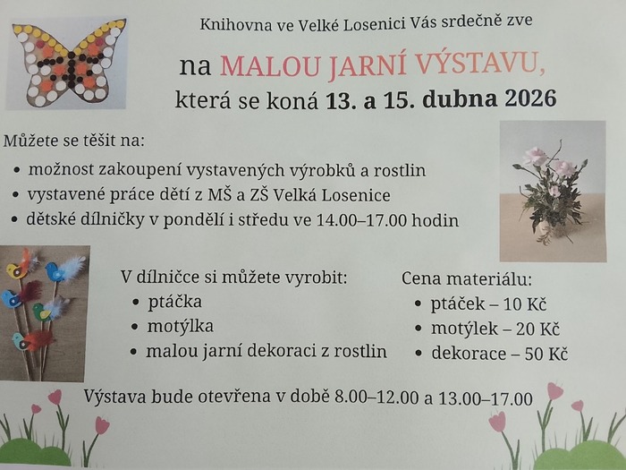 rádi bychom Vás informovali, že ve středu 15. 4. 2026 se po 14:00 hodině, kdy dětem skončí poslední kroužky, zúčastníme Malé jarní výstavy v místní knihovně, jejíž součástí bude také rukodělná dílna. Veškeré náklady spojené s touto akcí budou dětem plně hrazeny.